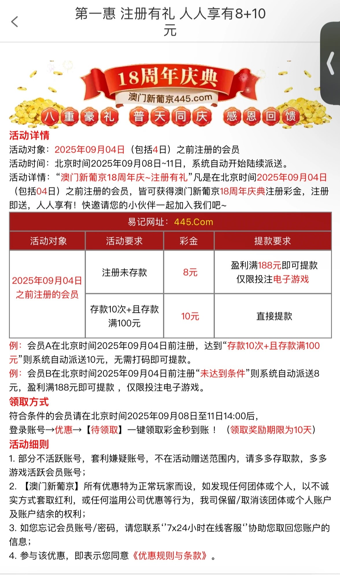 历史注册彩金存款达标10未达标8,这个台老哥们都有号。